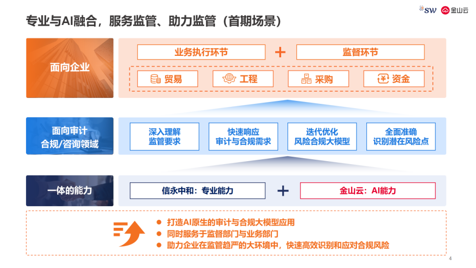作为首期,信永中和与金山云将共同围绕贸易、采购、工程、资金等四个领域场景,聚焦监督、业务执行等两个环节,分别推出针对监督部门的风险识别、合规识别的AI应用,以服务到内部审计部门或风险管理部门;以及将相关风险、合规要求置入业务环节的过程合规的AI应用,以服务到业务部门。