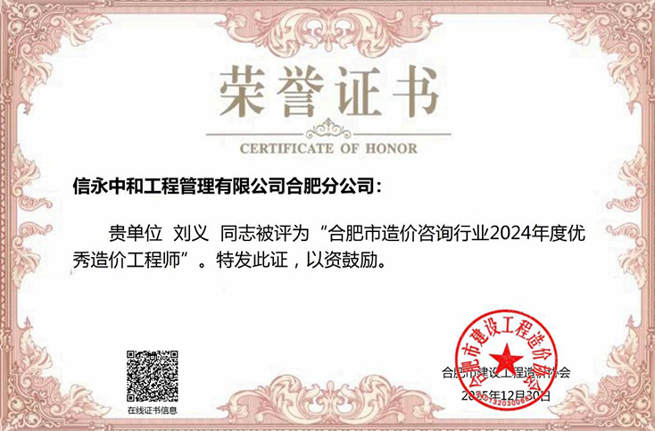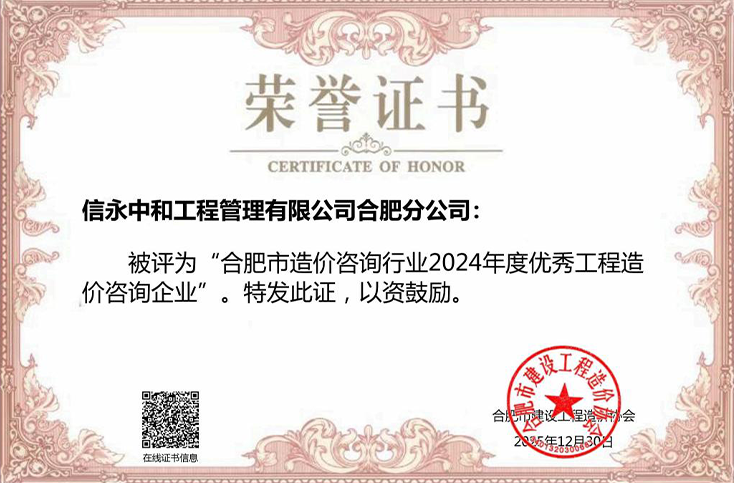 2025年12月31日,合肥市建设工程造价管理协会正式公布2024年度行业评优结果,信永中和工程管理合肥分公司获“2024年度合肥市优秀工程造价咨询企业”称号。分公司总经理刘义与经理徐波获评“2024年度合肥市优秀造价工程师”。此次“双优”荣誉的取得,是行业对信永中和综合实力的高度认可,亦是合肥分公司团队建设与个人发展成果的体现。